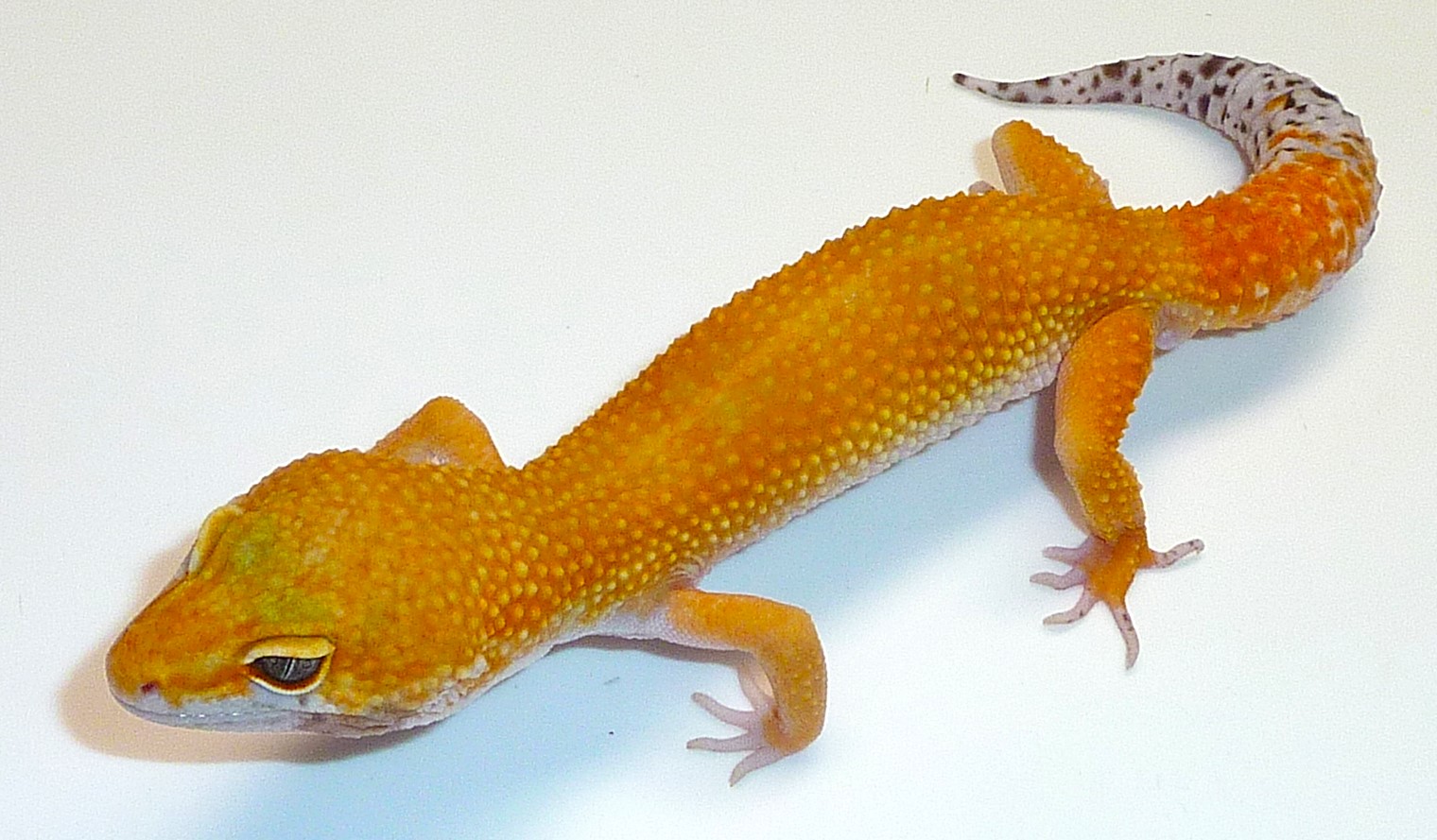 Blazing orange adult male leopard gecko is a friendly chap that is ready to breed. He is 8 inches long and 34 grams and feeding on a variety of insects.