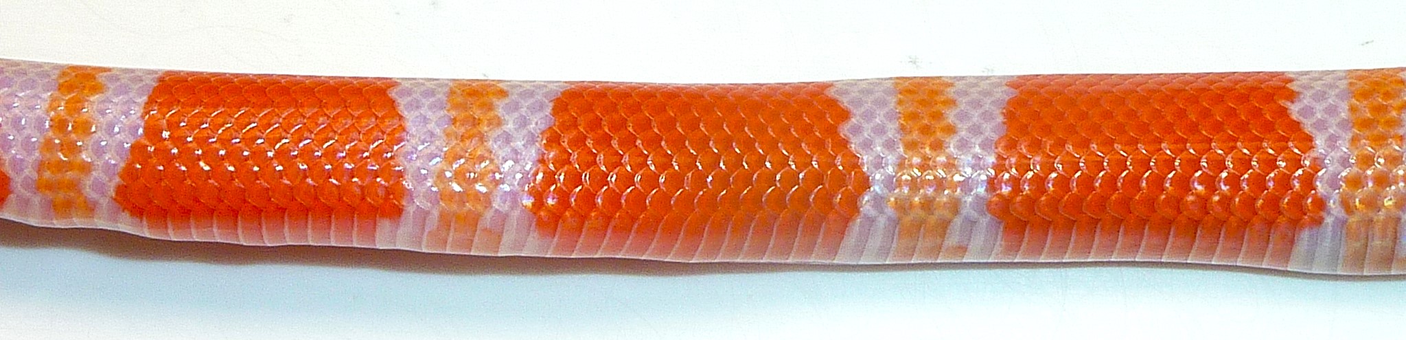 The white is crisp and clean and the orange is neon. He is 16 inches long and feeding on pinky mice.