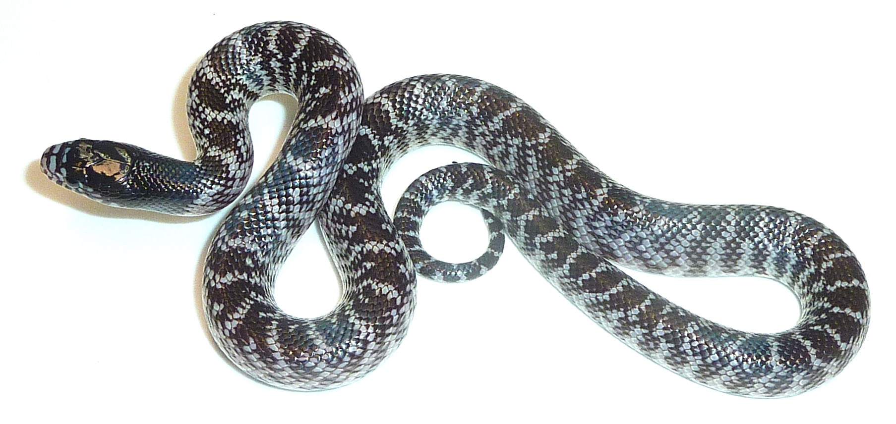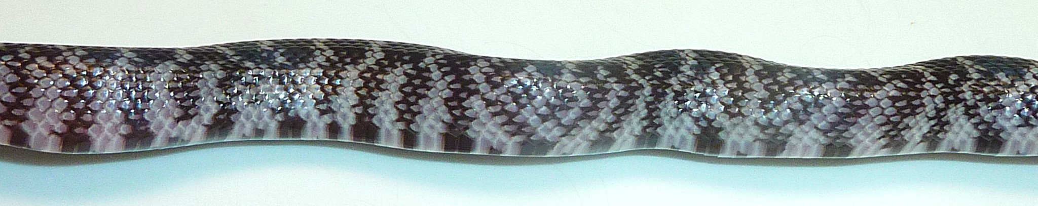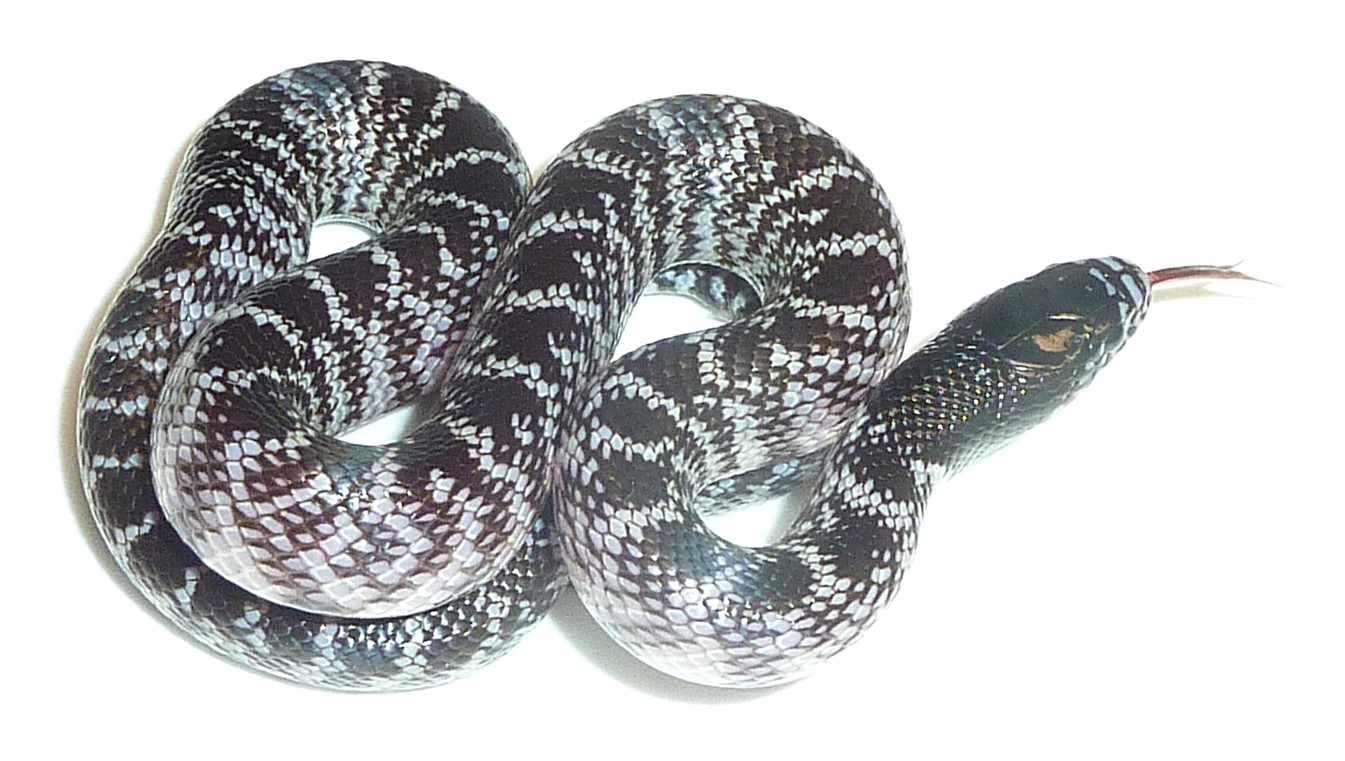 Stark silver and black contrasting Desert king male. He is 15 inches long and feeding on pinky mice.