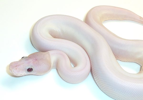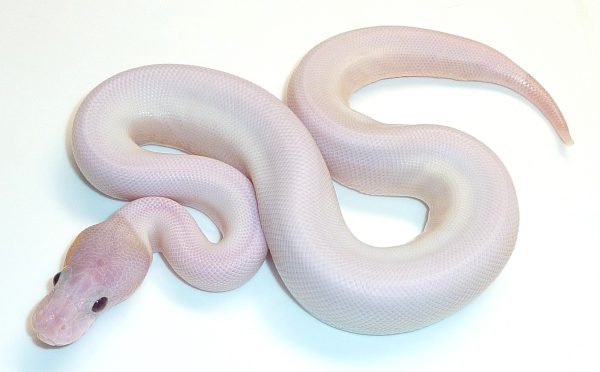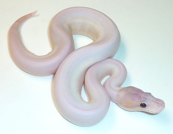 This snake is mostly white with a faint lavender head pattern. He is 63 grams and feeding on hopper mice.